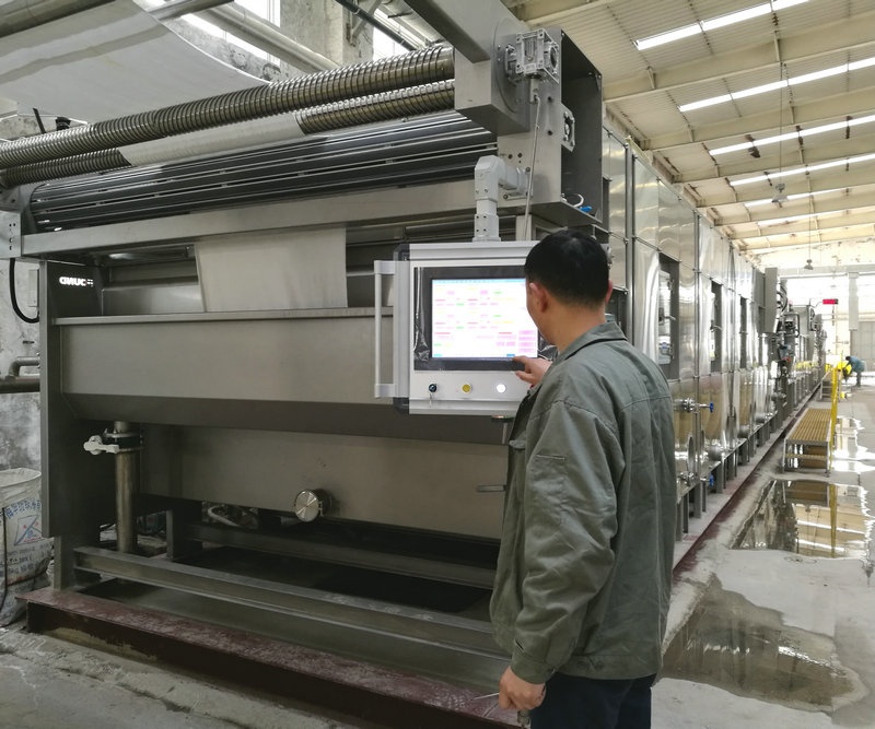 平幅煮漂机是低张力、高水洗效能的自动化针织棉前处理设备,煮漂机的主要作用就是去除纤维上的蜡质、果胶物质、色素以及矿物质等杂质,为后一道的染色历程提供需要的白度与毛效,以便抵达染料上色的基础。改变了古板的在染缸做前处理,之后再在染缸中完成染色历程、后水洗、固色等多道工序的加工工艺,有利于提高产品质量,节约能耗。