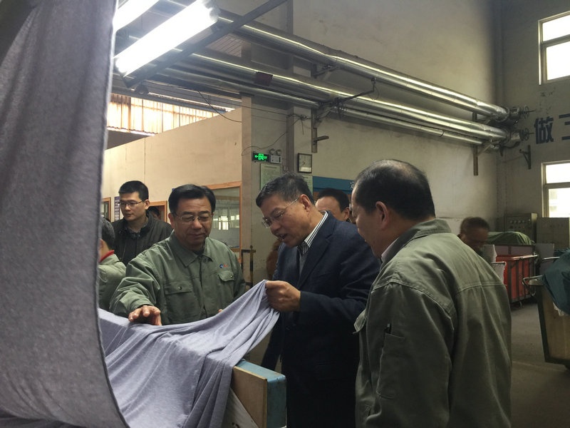 徐纪平副秘书长等领导到染部车间现场,实地观察了公司生产现场,向公司领导了解了公司今年经营情况和转型升级事情。莫总向调研组领导介绍了公司基本情况和近年来公司推进转型升级事情,特别是今年实施的淘汰落后产能实施智能化生产技改项目。调研组领导在车间里仔细观察了公司引进的意大利贝利尼公司生产的超低浴比溢流多功效生态匀染染色机,以及中央控制室,染料助剂自动化输送系统,对公司实施智能化生产技改的转型升级举措给予高度肯定,勉励公司领导进一步通过转型升级,推动企业向信息化、自动化、智能化偏向生长,实现节能减排,减员增效,提高企业竞争力,增进古板企业的新生长。
