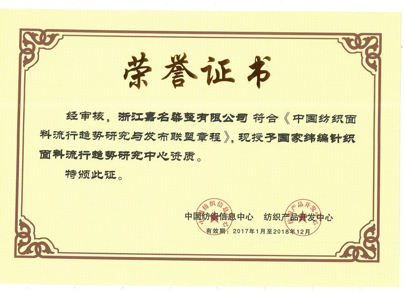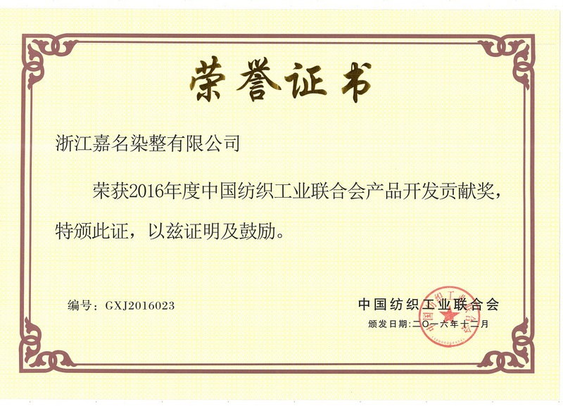 在中国纺织立异年会上,中国纺织工业联合会授予“仲博染整”“2016年度中国纺织工业联合会产品开发孝敬奖”;中国纺织信息中心、纺织产品开发中心授予“仲博染整”“国家纬编针织面料流行趋势研究中心资质”