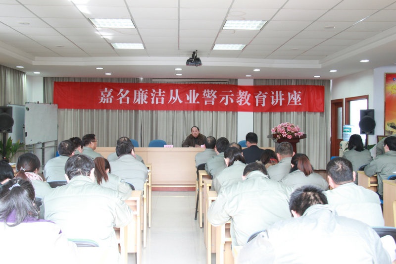 为增强经营治理人员的从业廉洁教育 ,增进公司上下认清形势、提高认识、遵章守纪、廉洁从业 ,12月26日下午 ,公司举办廉洁从业警示教育专题讲座。公司领导 ,各部分、各事业部卖力人 ,全体营销经理、外协人员 ,部分仓管员等50多人听取讲座。讲座邀请桐乡市检察院原党组成员、副检察长沈俊夫就非公企业职务经济犯法的预防进行了深入讲解 ,讲座还宣贯了《公司员工廉洁从业划定》 ,公司莫总讲了话。